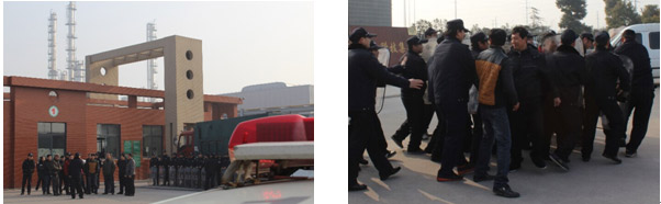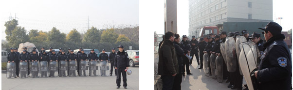 演练中,一群“闹事者”驾驶一辆卡车堵住公司一号大门,并叫嚣着要公司老板出面与之谈判,门卫保安紧急出动,制止“暴徒”进入厂区,同时向公司所在辖区的圩塘派出所报警,圩塘派出所接到警情后,组织二十多名警员,在金一飞副所长的指挥下迅速赶赴现场并启动“反恐防暴”应急处置预案,各路民警各司其职,一边由金副所长和公司领导出面与“暴徒”展开谈话稳定“暴徒”情绪,一边由二十几名警员组成防暴墙防止“暴徒”进一步的暴动。^终,在谈话无效的情况下,派出所民警利用娴熟的战术将“暴徒”制服并带离现场,一号门卫处秩序恢复正常。