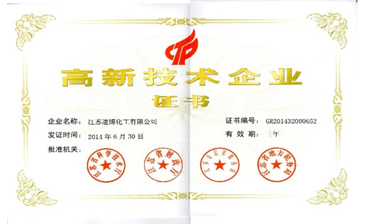 2014年,江苏道博化工有限公司捷报频传,5月获批“江苏省民营科技企业”证书,12月初又获得了江苏省科学技术委员会颁发的“江苏省高新技术企业”认定证书。