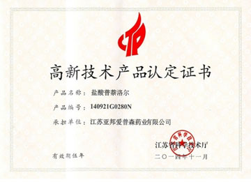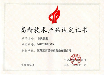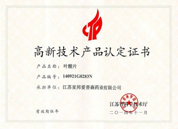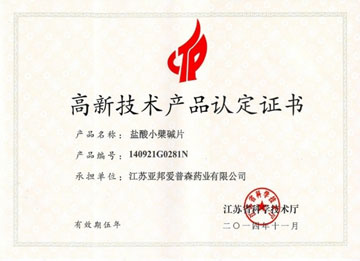 近日,江苏亚邦爱普森药业有限公司"愈美胶囊"、“苯磺酸氨氯地平片”、“盐酸普奈洛尔片”“叶酸片”、“盐酸小檗碱片”五个品种获得了江苏省科技厅颁发的高新技术产品认定证书,至此爱普森药业已有14项产品获得了江苏省高新技术产品认定。