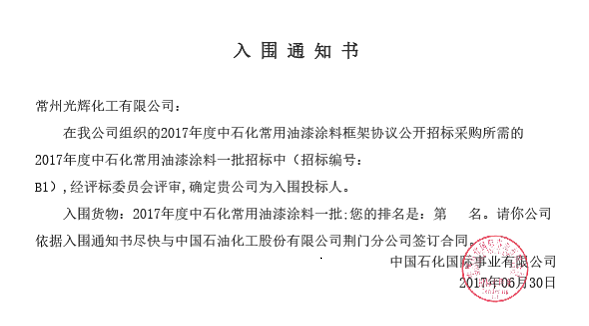 作为国内知名的油漆生产厂家,光辉化工以优质的产品、良好的售后服务得到众多客户的认可,在同类市场中拥有较高的份额,成为行业内公认的领航者。本次入围中石化供应商名单,也是市场对光辉产品的肯定,对光辉持续发展的认可!