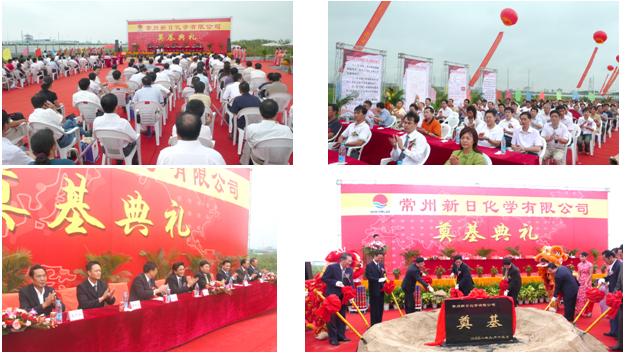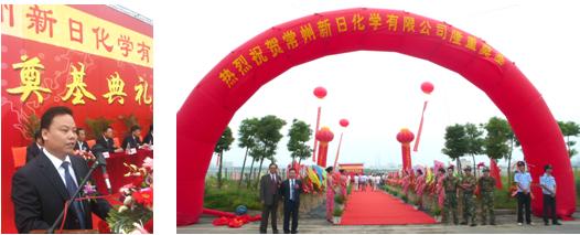9月的初秋,金风送爽,花果飘香。13日,常州市高新区滨江工业园区彩旗飘飘,鼓声震天,巨型气球悬挂着“新日初升携祥云紫气东来,宾主欢聚奠基业百年常青”的对联迎风招展。主席台前花团锦簇,主席台旁侧8枚礼炮排列整齐,象是在等待检阅的卫士。常州新日化学有限公司的奠基仪式在这里隆重举行。常州市人民政府副市长韩九云,常州市高新区管委会主任、新北区人民政府区长杨平平,常州市高新区管委会副主任戴晓文,常州市新北区人民政府副区长蒋雪勤,常州市新北区春江镇党委书记戴士福,常州市化工行业协会会长、亚邦化工集团有限公司董事长许小初,澳门新阳集团总裁、常州新日化学有限公司董事长张文俊,常州新日化学有限公司总经理奚慧克,台湾国精化学股份有限公司董事长蔡有凉,亚邦集团总经理杨建,集团各分公司董事长、总经理,涂料产业供应商和客户等200余名嘉宾出席奠基仪式。