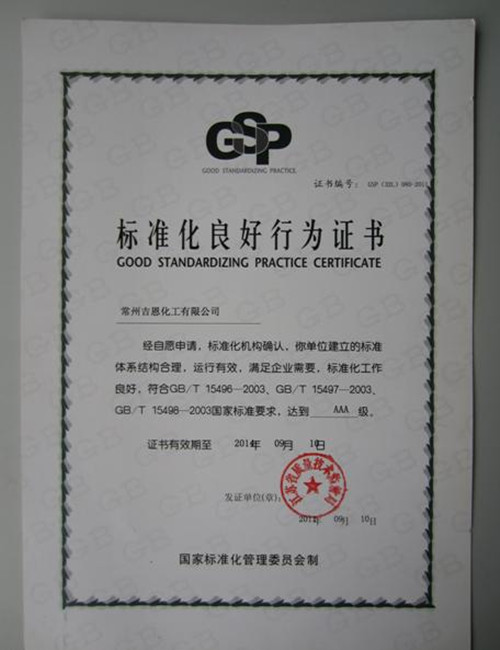 吉恩化工获江苏省标准化良好行为AAA级证书
