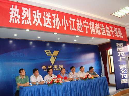 造血干细胞是血细胞的鼻祖,没有大爱无私、奉献社会的崇高精神和勇于捐献、拯救他人生命的责任感,就不会有将生命的源泉进行无偿捐献的勇气。孙小江这种对生命的珍重、大爱无疆的举动必然有他的内在动力。而他的这种动力,正如他自己讲的那样“我只是履行亚邦人的一份责任而已。”多年来,我集团在经济快速发展的同时,勇于承担社会责任,将尊师重教、扶危济困、助老助残为己任。2006年成立“亚邦千万光彩基金”,同时向武进慈善总会捐赠1000万元;“5·12”大地震,集团两赴灾区,千万元救灾物资见证了亚邦与灾区的手足情深;至今,集团为社会公益事业、慈善事业、教育事业累计捐款近亿元。董事长许小初个人资助困难群众和学生就达数百名之多。2008年,许小初董事长许下了“愿天下白血病人都能康复”的心愿,并公开承诺:生命终结时,将捐献全身器官!昭然的善心、示人的承诺,亚邦员工积极响应,在集团内部形成了一股回报社会、关爱生命的慈善之风。2009年6月3日,我公司组织了包括孙小江在内的第一批志愿者13人在常州市中心血站进行了捐献登记和干细胞采样。