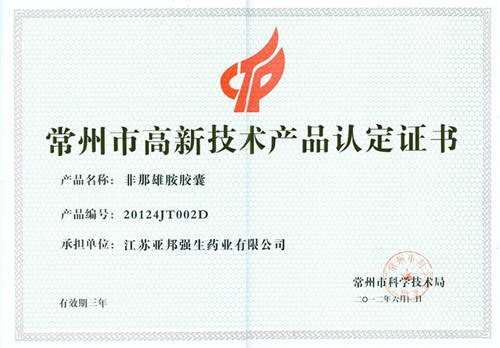 强生药业非那雄胺胶囊和那格列奈片两个产品,经常州市科学技术局^评审,于6月荣获2012年常州市高新技术产品认定证书!