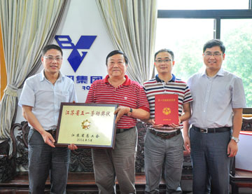 6月26日,江苏省机冶石化工会主任董明伟、吴亚东和省总工会副主任张旭海在常州市总工会副主任张小军等领导的陪同下,专程到我集团总部颁发“江苏省五一劳动奖状”证书和奖牌,我集团公司工会主席张展羽热情接待。
