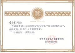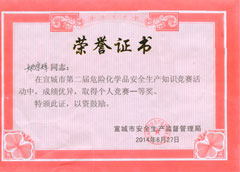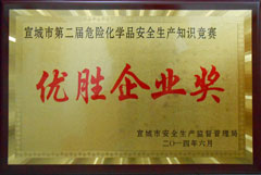 经过一番激烈的角逐,^终宣城亚邦取得了团体优胜奖的好成绩,姚宗辉荣获个人一等奖、喻忠宏荣获个人二等奖,受到市、区安监局领导的肯定和好评。区安监局王继灿副局长高兴地说:“宣城亚邦虽然经历了‘2.3’事故之痛,但是并没有被困难吓倒,经过一年多来的努力,安全生产管理水平有了显著提高,逐步走上一个新的台阶。这次竞赛取得了令人满意的成绩,正说明企业领导对安全工作高度重视,主管部门不懈努力的结果。希望宣城亚邦化工不断完善安全管理制度,提高安全生产标准化水平,继续抓好安全教育,加大现场安全管理力度,严格管控重大危险源,争取成为宣城地区安全生产的标杆企业,带动整个宣州区安全生产管理水平进一步提高。”